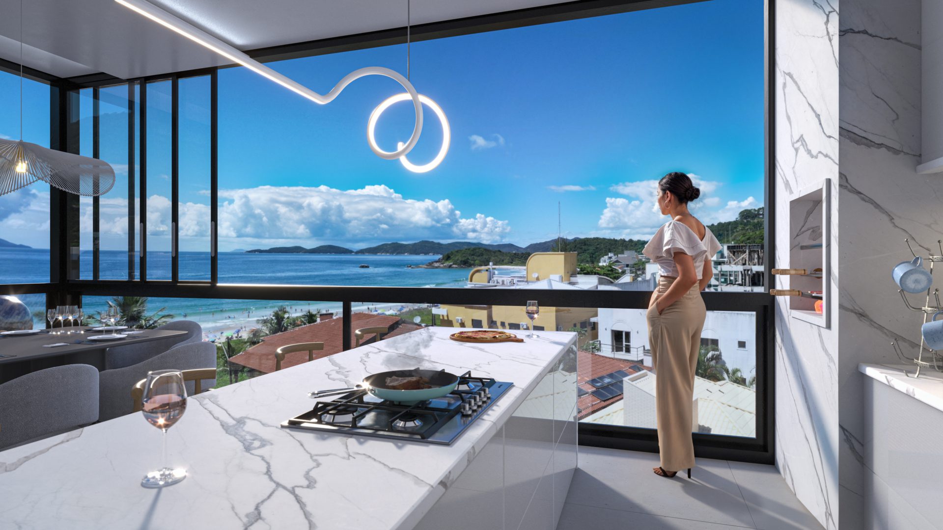 La fachada moderna y los ambientes espaciosos reflejan el equilibrio entre estética y bienestar. Cada espacio fue planeado para aprovechar al máximo la luz natural, la vista al mar y la sensación de tranquilidad que define la costa de Santa Catarina.